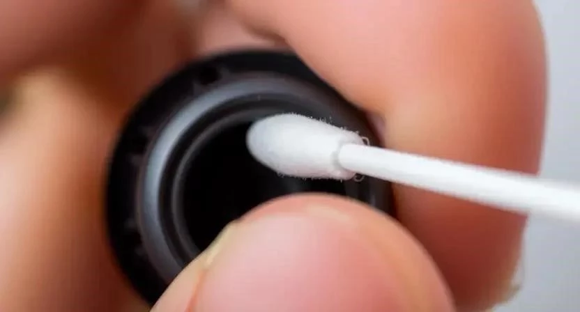 - Слегка смочите ватную палочку в изопропиловом спирте (или антисептике). Важно, чтобы палочка была влажной, а не мокрой.