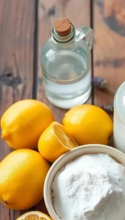 - Ингредиенты: 1/2 стакана уксуса, 1/4 стакана соды, 5 капель эфирного масла (лимона).