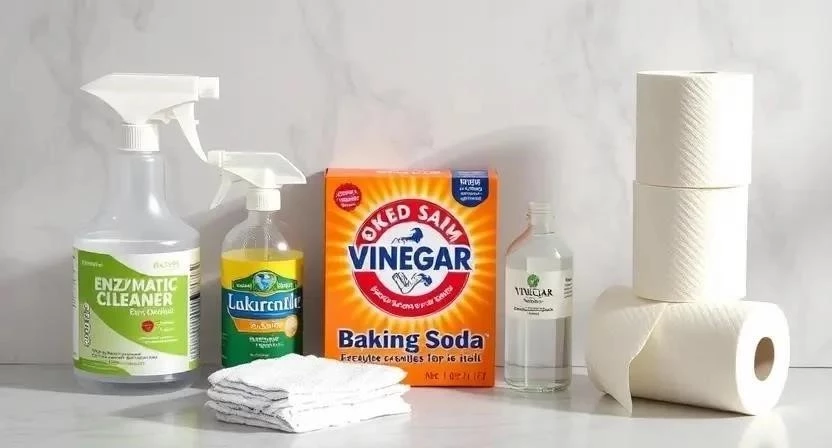 Ответ: Немедленно промокните мочу бумажными полотенцами, затем обработайте поверхность ферментным очистителем или раствором уксуса и воды.