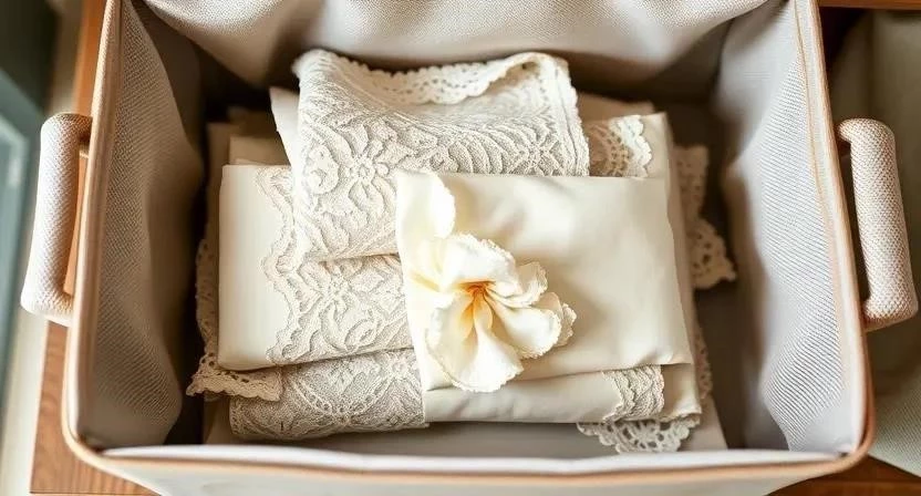 Используйте специальные контейнеры или тканевые мешочки, защищающие от пыли и моли. Не храните кружево в полиэтиленовых пакетах.